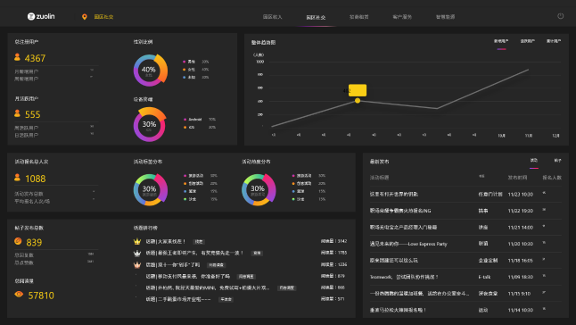 實(shí)時(shí)掌握用戶動態(tài),描繪用戶畫像園區(qū)注冊用戶、活躍用戶、帖子數(shù)、活動參與情況等